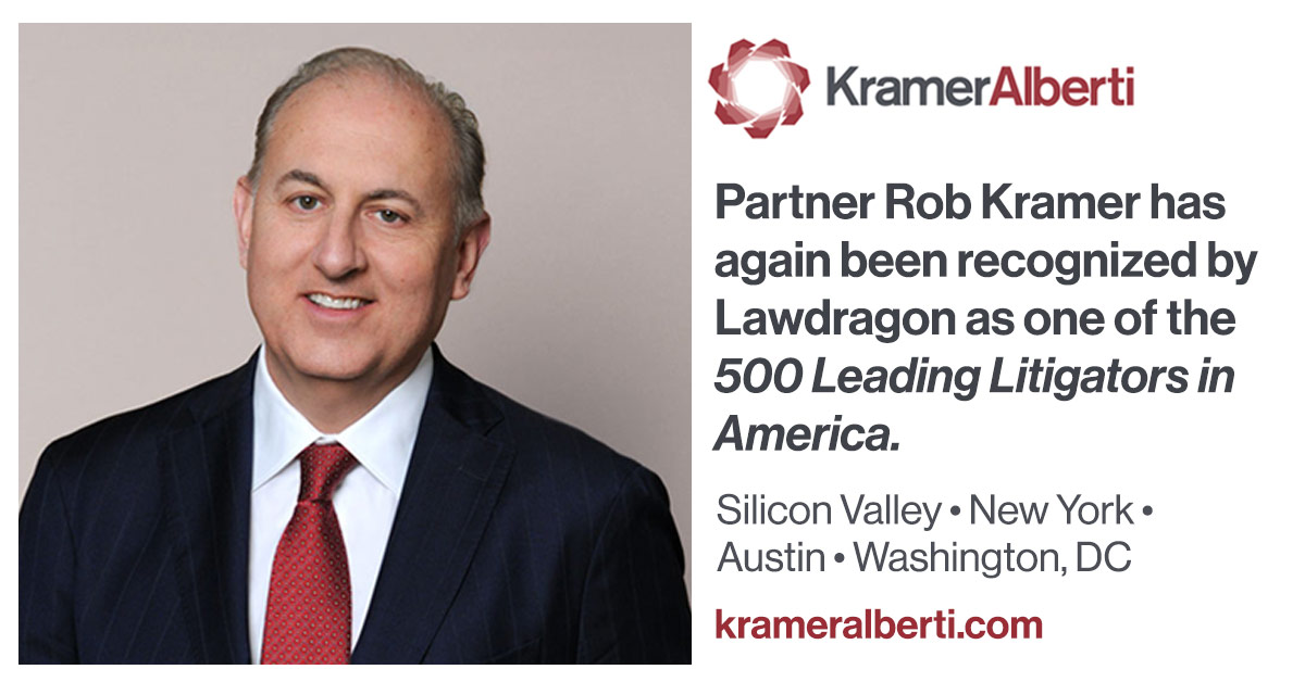 Kramer Alberti attorneys are passionate courtroom champions of their clients’ inventions, and nationally known as among the very best and most experienced patent litigators in the country. Founded in 2010, and based in Silicon Valley with attorneys in New York, Austin, and Washington, D.C., the firm is a highly sought-after patent litigation solutions provider representing inventors, technology companies, and universities enforcing their most valuable patents against infringement. With a team of more than 20 technically trained and experienced patent litigation trial attorneys, the firm represents an unrivaled assembly of specialized practitioners. A frequent recipient of national recognition from and within the legal community, the firm is one of a select few to have been named to both the National Law Journal’s and Texas Lawyer’s list of Top Verdicts. Kramer Alberti is positioned as the firm of choice for plaintiffs seeking large recoveries in patent monetization and clients in need of objective-based IP solutions. For more on Kramer Alberti, please visit www.krameralberti.com